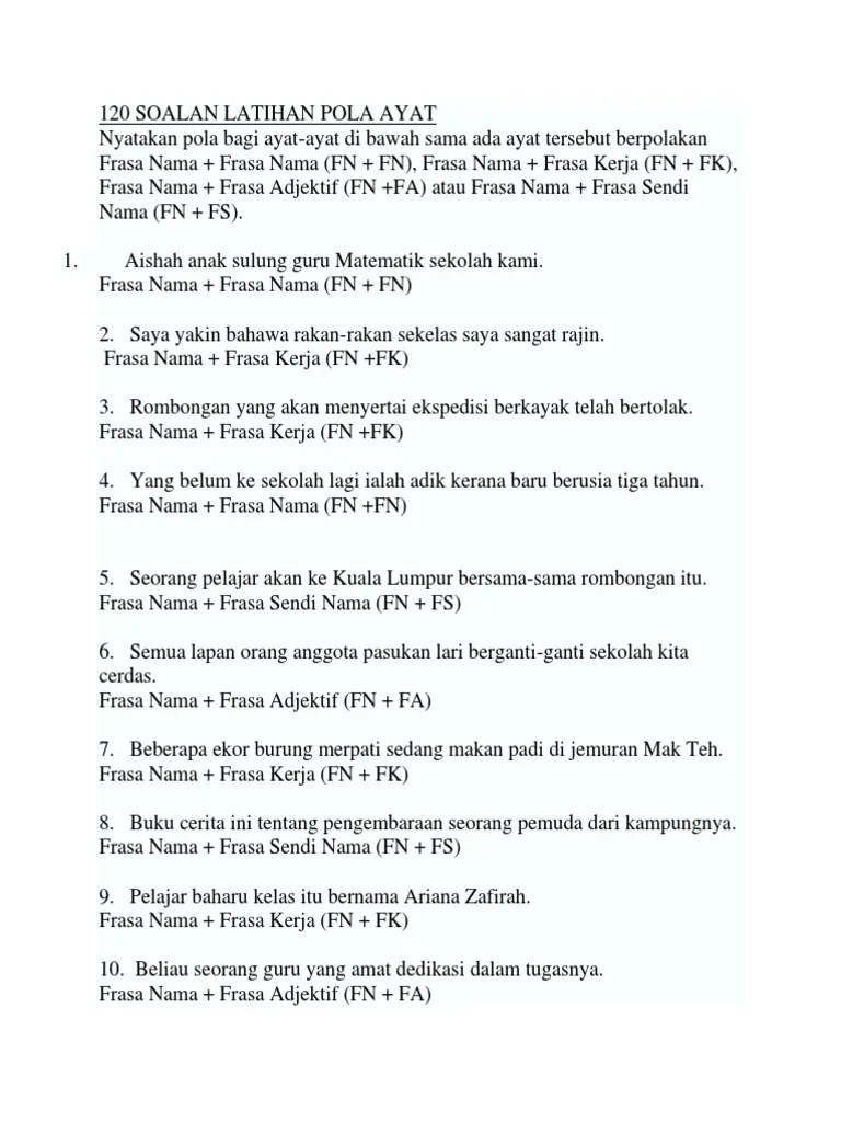 Pola ayat frasa nama dan frasa sendi nama. Frasa nama + frasa sendi nama mereka | ke pahang jumaat lepas. Laili | dari sekolah ketika ayah . Frasa adjektif dan frasa sendi nama. Frasa terbahagi kepada empat, iaitu frasa nama, frasa kerja, frasa adjektif dan frasa sendi nama. Frasa nama + frasa sendi nama (fn+fs).
